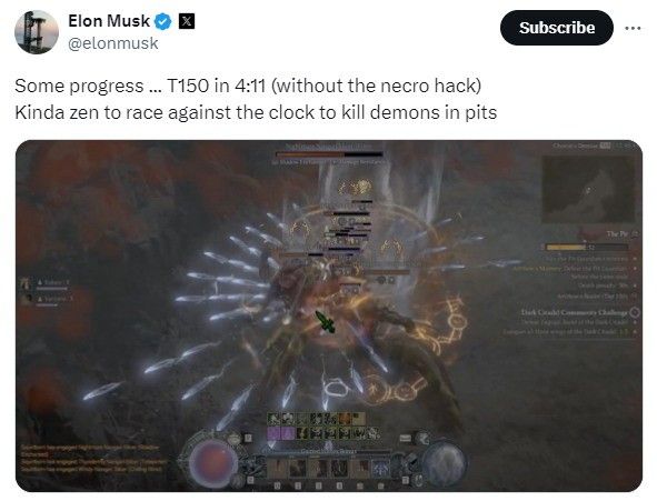 近日马斯克在推特上分享了他玩《暗黑破坏神4》的短视频。他又弄出个新纪录——4分钟便打穿深坑150层,使用的职业是“灵巫”。
