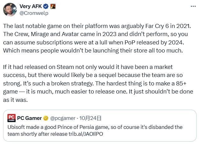 Michael Douse在X发文说到:“他们平台上最后一款值得关注的游戏可以说是2021年的《孤岛惊魂6》。《飙酷车神》、《刺客信条:幻景》和《阿凡达:潘多拉边境》于2023年推出,但表现不佳,因此你可以假设,当2024年《波斯王子:失落的王冠》发售时,订阅量处于低迷状态。这意味着人们不会过多地关注他们的商店。