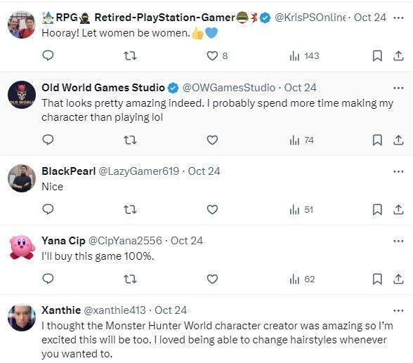 评论区有玩家表示:“看起来很神奇,我花在塑造角色上的时间可能要比游玩时间多。”“我会百分百购买这游戏”“我认为《怪物猎人》角色创建器很惊人,我可喜欢随时改变发型。”