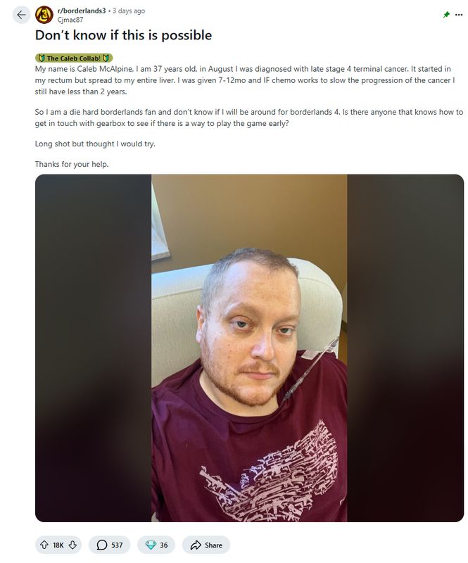 这位癌症晚期《无主之地》粉丝名叫Caleb,是一位37岁的退伍军人,被诊断出患有癌症四期,几天前他在《无主之地》Reddit板块上发文求助,他是该系列的铁杆粉丝,但现在由于病情恶化,Caleb生命期限不足两年,他觉得自己可能无法坚持到系列新作《无主之地4》发售,因此希望能联系到Gearbox提前玩上《无主之地4》。