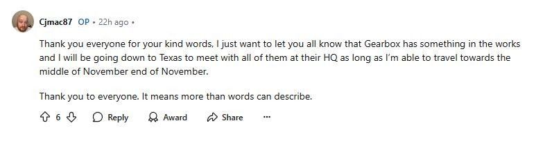 现在,根据Caleb更新的贴子,他表示Gearbox正在筹备一些事情,如果他身体健康,他就会在11月中旬至11月底之间出发前往Gearbox位于德克萨斯州总部,与开发人员会面,他十分感谢Gearbox和游戏社区为他所做的一切。