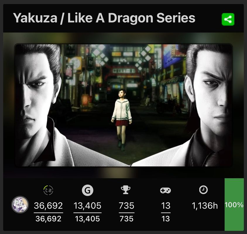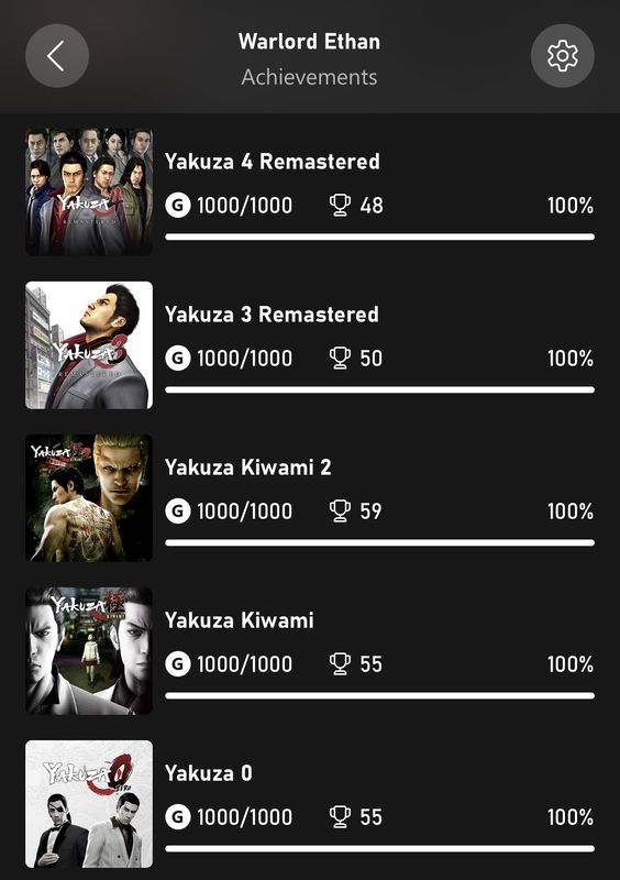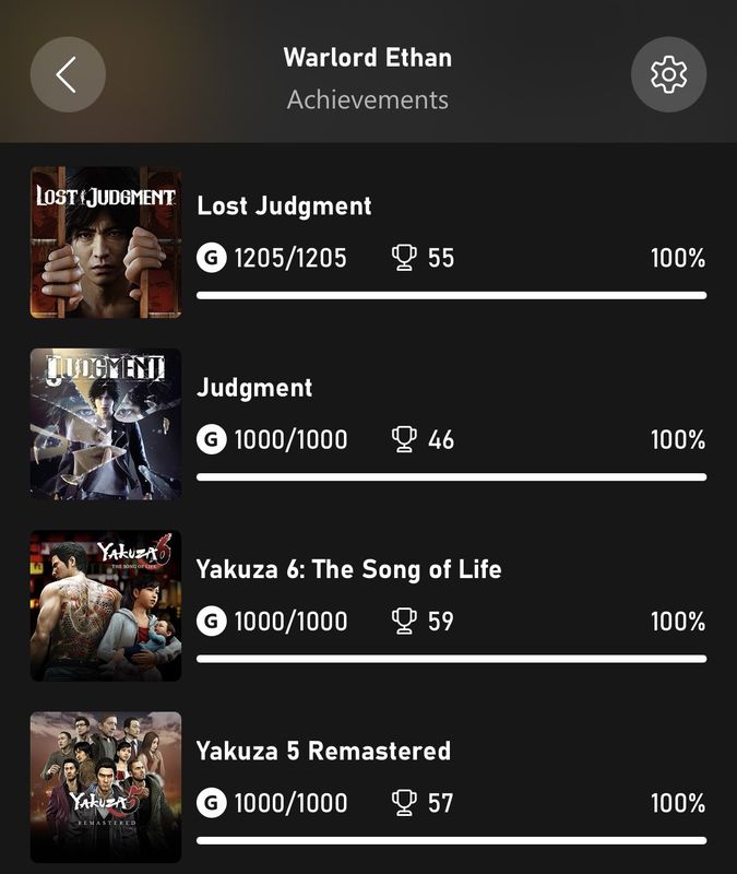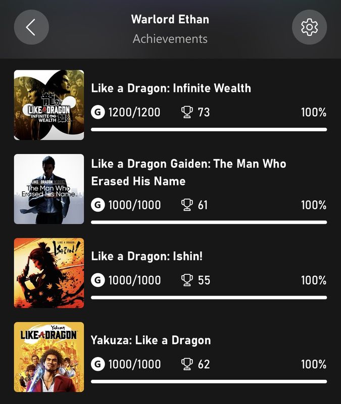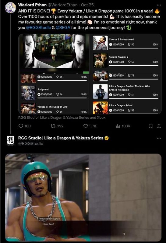不过《如龙》系列的粉丝玩家可能更关注的还是游戏作品,例如最近完成了1年内全部100%通关系列游戏成就的玩家“Warlord Ethan”。