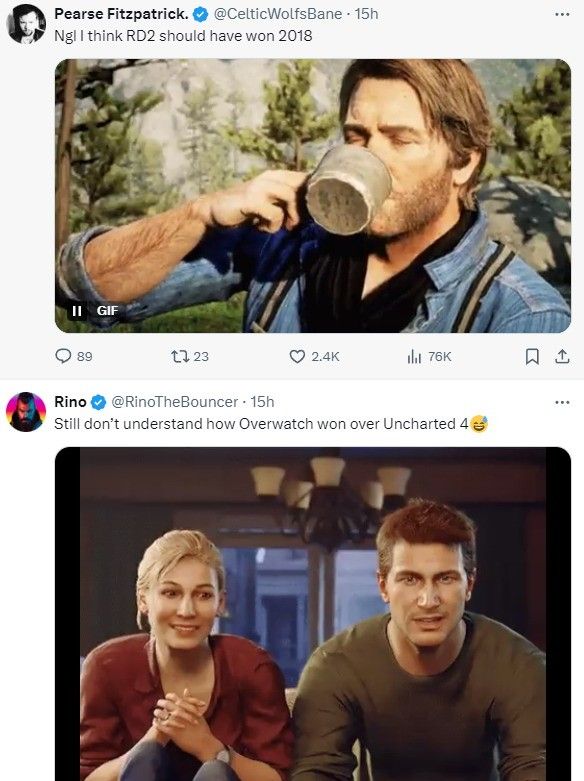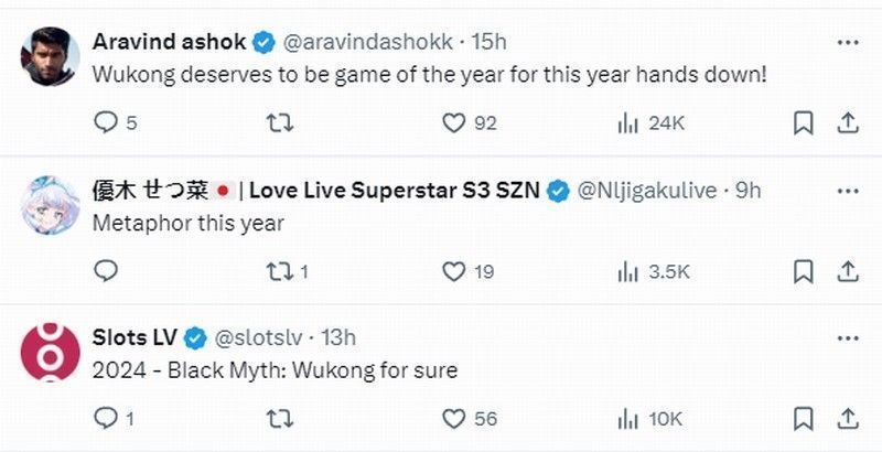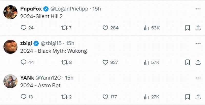 评论区有玩家认为:“2016年年度游戏应该是《神秘海域4》”“2018年年度游戏应该是《荒野大镖客2》”。关于2024年年度游戏,有人认为《寂静岭2:重制版》或《宇宙机器人》将夺得桂冠,但更多人认为《黑神话:悟空》当之无愧是今年的年度游戏。