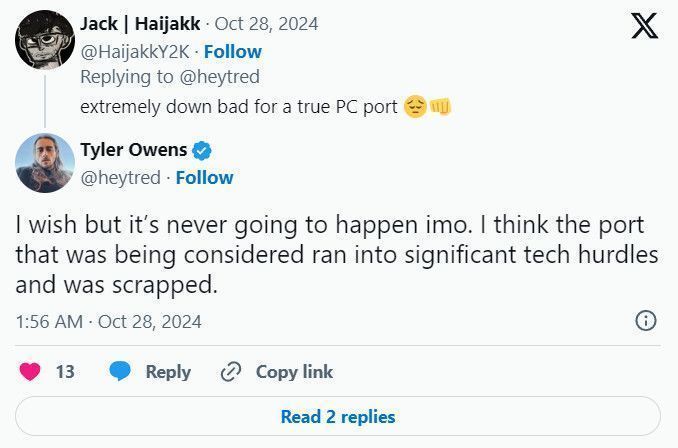 前开发者Tyler Owens发推称《光环5》原本考虑移植PC平台,然而遇到了“重大”技术障碍,后来被遗弃。开发人员无法说出哪些技术障碍最终阻碍了移植,但很有可能是因为帧率与物理相关,这是游戏开发时许多开发人员都在做的事情。