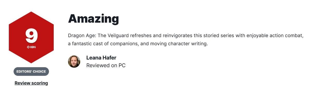 Bioware的“龙腾世纪”系列最新作品《龙腾世纪:影障守护者》媒体评分现已解禁,诸多媒体都在第一时间给出了评价。其中备受玩家关注、讨论热度极高的媒体IGN给这款游戏打出了9分(Amazing)。