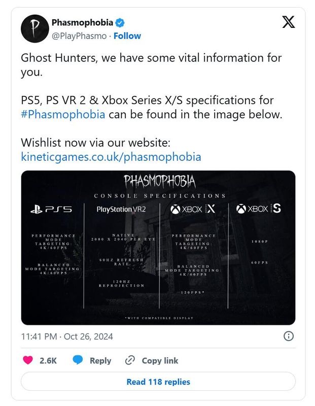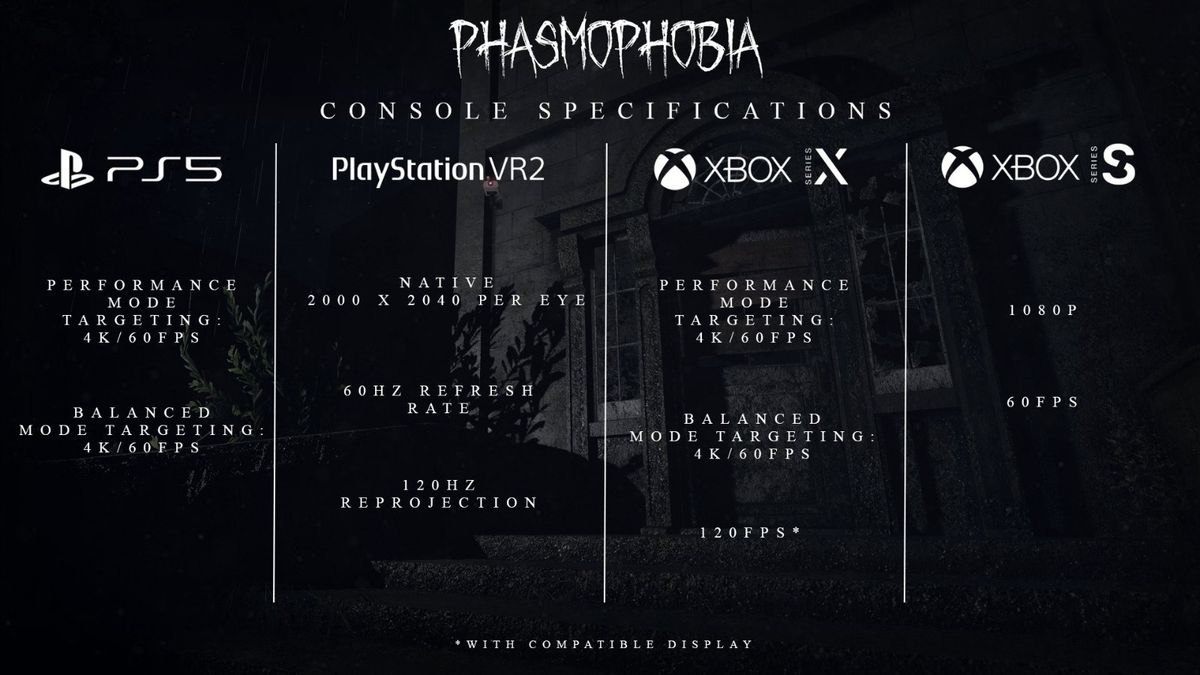 在Xbox Series S上,《恐鬼症》将以1080p和60FPS运行,没有其他图形模式可供选择。最后,在PlayStation VR2上,游戏将以单眼2000×2400原始分辨率运行,刷新率为60Hz,重投影率为120Hz。