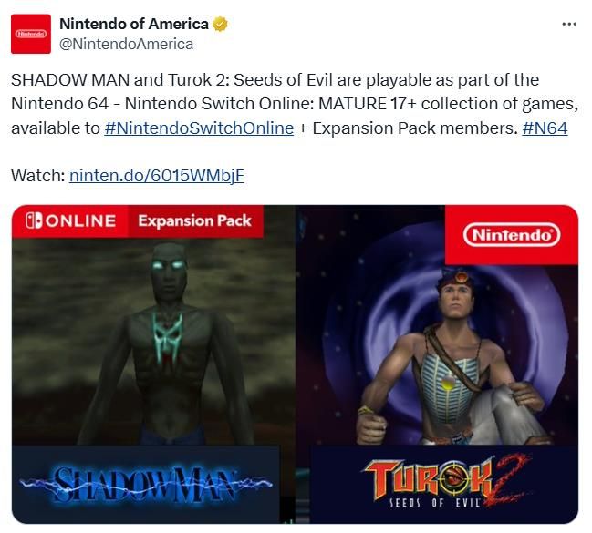 10月29日,美服Switch Online会员经典游戏库宣布将新增两款N64游戏:《夜影侠》和《恐龙猎人2:罪恶之种》,即日起正式上线,订阅了Switch Online会员+扩展包的玩家可以免费畅玩。