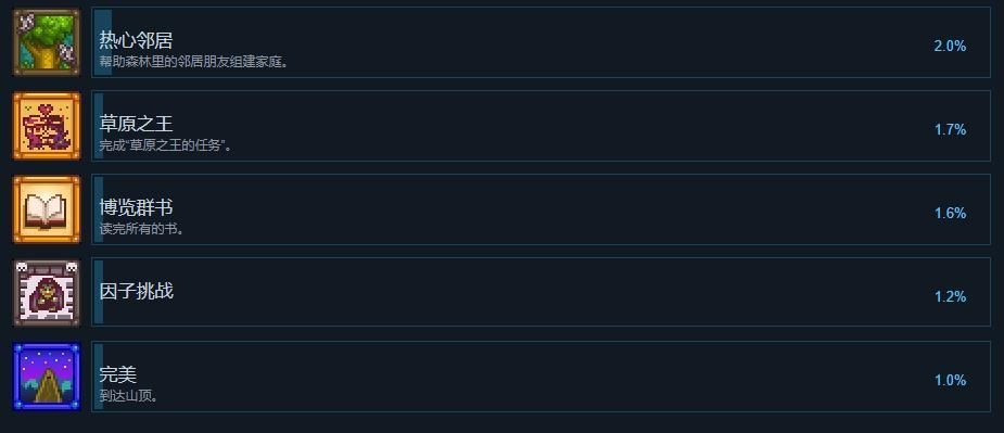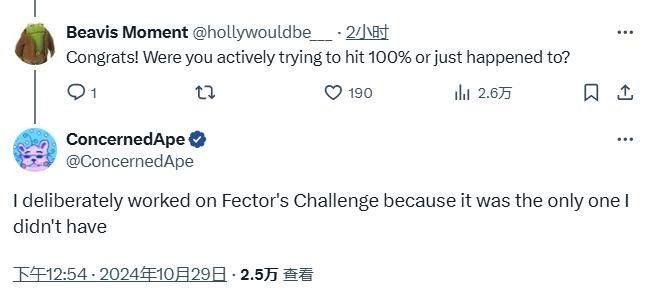 有趣的是,ConcernedApe在评论中还提到,在此之前,他唯一没有的成就是“因子挑战”,对此他专门进行了练习。“因子挑战”是游戏的一个隐藏成就,需要玩家无伤通关游戏中的小游戏“草原王者大冒险”才能获得。在《星露谷物语》Steam成就中,“因子挑战”获取率是第二低的(1.2%),仅次于“完美”(1.0%),这是玩家达成100%完美度后前往山顶才能获得的成就。