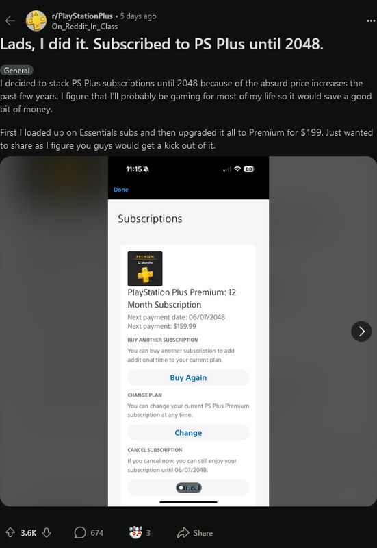 在海外论坛 Reddit 上,一位用户 On_Reddit_In_Class 透露,自己花费了2000 美元提前续订了24 年的 PS+ 会员。