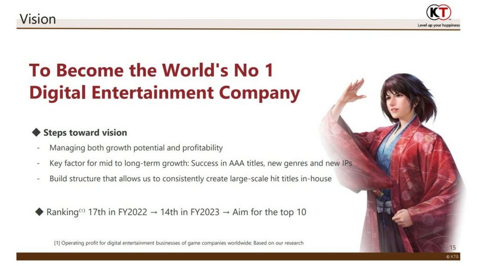 在财报幻灯片里,公司显示出了非常大的野心,称目标是“成为全世界第一的数字娱乐公司”,财报的其他地方它确认其目标至少是“成为全球最赚钱的10 大游戏公司之一”。为达成这一目标,公司计划将努力每年推出一款主要游戏,而不是间隔多年才推出一款作品。