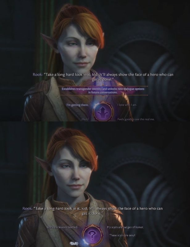 近日游戏博主Mangalawyer发现《龙腾世纪4》的对话在宣扬ZZZQ价值观:在某个对话中,系统提示玩家可通过创建跨性别角色解锁更多对话选项,有网友表示这是变性人总监在夹带私货。