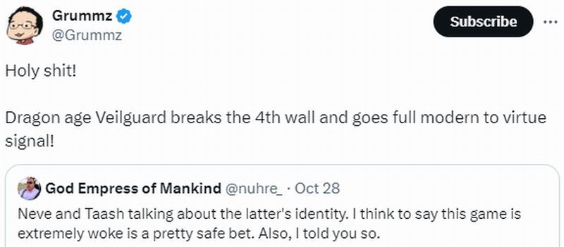 还有获得测试资格的玩家发现,《龙腾世纪4》NPC竟然也在大谈"性别认同" 。前暴雪制作人Grummz表示:“《龙腾世纪4》打破了第四面墙,完全以‘现代化’方式彰显了美德!”