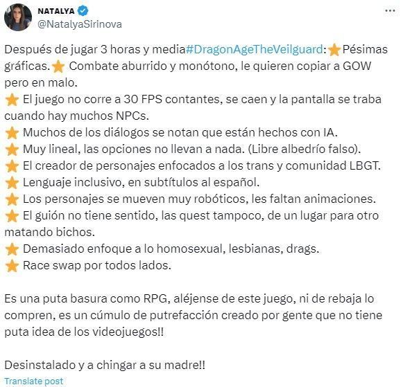 此前参与了《龙腾世纪4》测试的美女博主Natalya Sirinova表示:“《龙腾世纪4》画面糟糕,战斗无聊单调。游戏充满Bug,出现大量NPC时游戏会崩溃。剧情线性,玩家选择毫无意义。游戏过于ZZZQ,对同性恋的关注过多。这就是一款垃圾游戏,奉劝大家别买,打折也别买!”