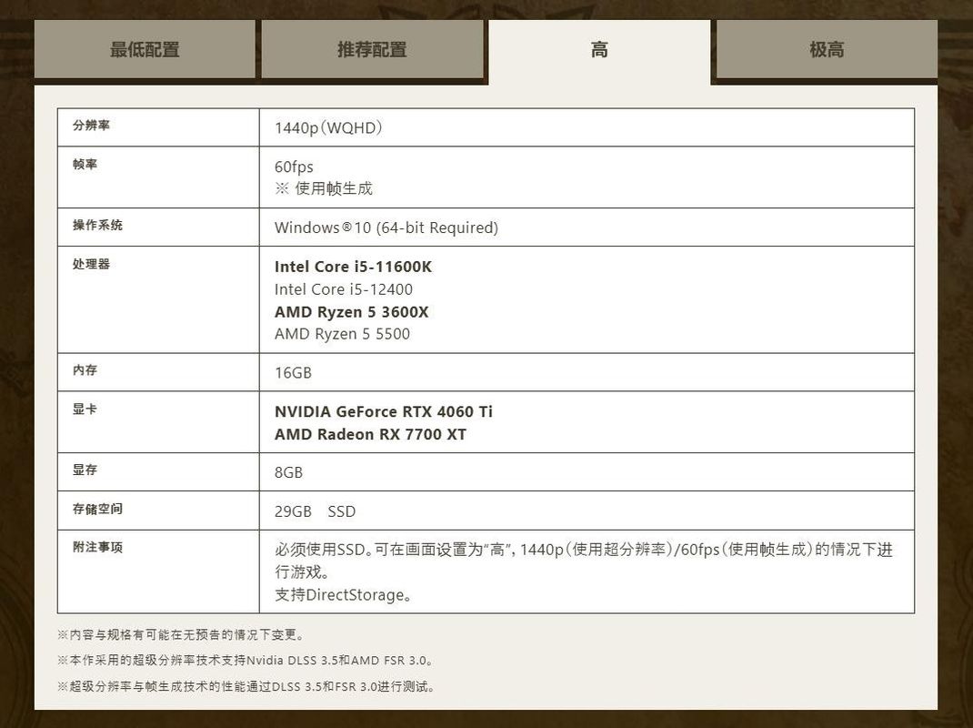 根据官网上的信息显示,以2K/60帧(画质设置“高”)运行《怪物猎人:荒野》需要CPU:i5-11600K或i5-12400或R5 3600X或R5 5500,显卡:RTX 4060Ti或RX 7700XT,并且还需要开启DLSS或FSR和帧生成。而4K情况下,以4K/60帧(画质设置“极高”)运行《怪物猎人:荒野》需要的CPU与2K设置下一致,但显卡要升级到RTX 4070Ti或RX 7800XT,一样也要开启DLSS或FSR和帧生成。