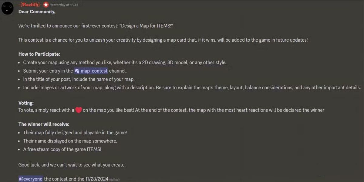 Fntastic在游戏的官方Discord频道上发文称:“本次比赛是一个让大家释放创造力的机会,大家可以设计一张地图,如果获胜,这张地图将在未来的更新中被添加到游戏中!”