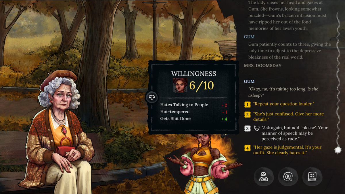 做你自己最坏的一面。来吧,踢那个老妇人一脚。别害怕。我们会倒带时间,她甚至不会记得。来吧。你知道你想要。没关系。去做吧。