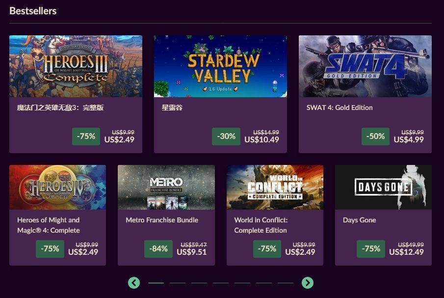 与 Steam 等平台不同的是,该平台上所有游戏均没有 D 加密,购买后游戏就真的完全属于你。当然相应的游戏选择可能没有那么多,但包含了大量经典作品,例如《魔法门之英雄无敌》系列、《潜行者》系列、《杀出重围》系列等。其中《地铁》全系列仅需9.51 美元,而《英雄无敌》全系列补卡仅需17.44 美元。