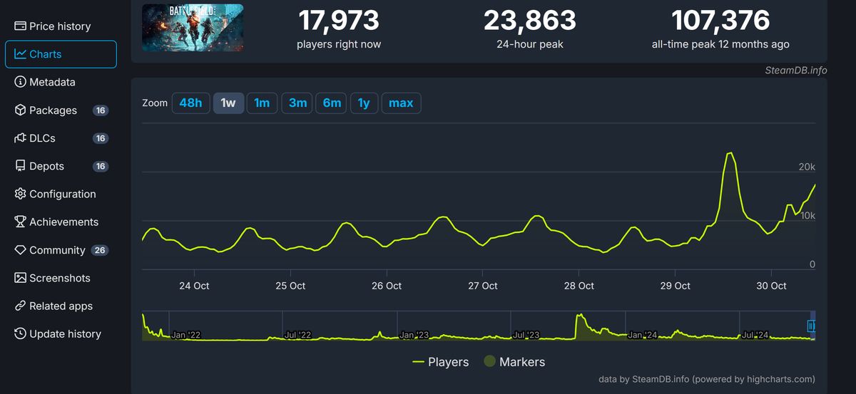 受万圣节活动和史低价促销的双重刺激,《战地2042》在Steam上的在线玩家提升了不少,当前24小时峰值23863人,当前在线17973人。