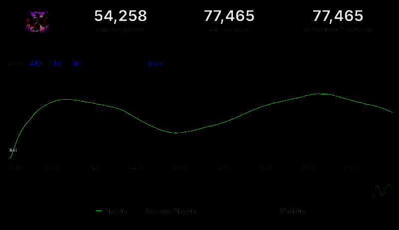 游戏还算是获得了及格的成绩,在 Steam 上首发玩家峰值超过了7万人,在平台上目前排名第20 位。这虽然可以说是不错的表现,但对于一款3A 作品来说仍不尽人意;相比之下,《博德之门3》历史玩家峰值位 87 万人,而最近在进行的《怪物猎人:荒野》Beta 网络测试即便面临着许多性能问题,也有过46 万人同时在线的成绩(当然不得不提测试优化确实问题严重,希望正式版能够有更大的改进)。《黑神话:悟空》24 小时内的峰值仍为 12 万人同时在线。