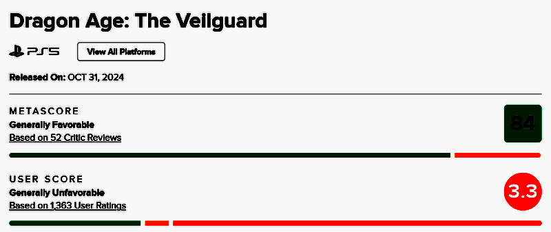另一方面,游戏的口碑似乎也面临着危机。在游戏发布前,媒体评测就已经公布。根据综合评测统计网站 Metacritic,PS5 版本的媒体评测稳定在 84 分的均分(满分 100 分),其中,许多媒体都给出了10 分满分——而这些分数也遭受了质疑,因为显然 EA 在发布评测版本是进行了针对性的选择,只给那些更有可能给予好评的评测者游戏发送了代码。