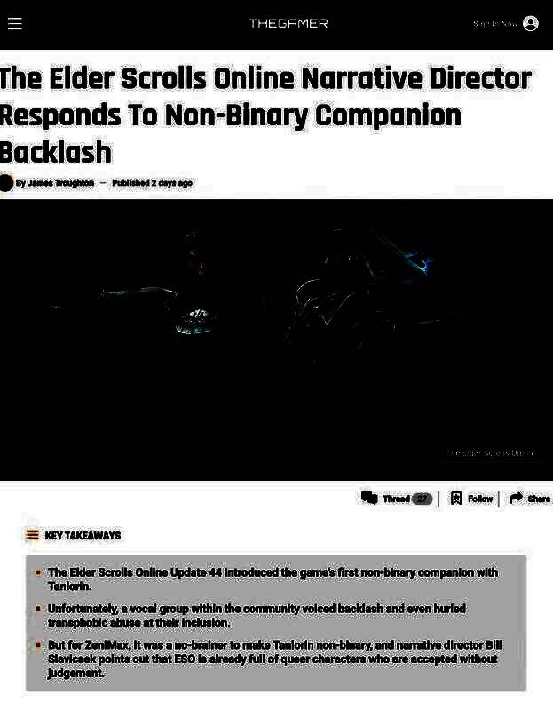 愤怒的玩家表示非二元同伴Tanlorin破坏了沉浸感,根本不适合《上古卷轴》的世界,对此叙事总监Bill Slavicsek表示:“他们错了。”