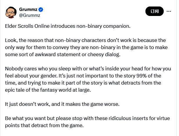 推主Grummz表示:“非二元角色之所以行不通,是因为他们在游戏中表达自己是非二元角色的唯一方式就是发表一些尴尬的声明或俗气的对话。