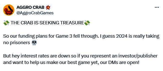 Aggro Crab在X发文说道:“螃蟹在寻宝。所以我们的第三款游戏融资计划落空了。我想2024年真是不留情面。但是嘿,利率下降了,所以如果您代表投资者/发行商并希望帮助我们制作迄今为止最好的游戏,我们的DM是开放的!”