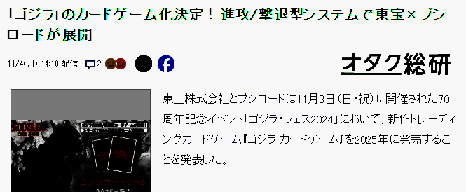 知名日系怪兽IP哥斯拉确定推出《哥斯拉卡牌游戏》,预定2025年发售,在11月3日举行的《哥斯拉庆典2024》上官方宣布了这个消息,敬请期待后续消息。