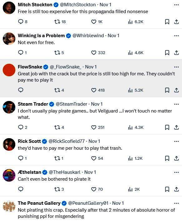 在评论区,有玩家表示:“就游戏正确宣传来看,即使游戏免费了也仍太贵!”“给我钱,我都不玩!”“破解工作做得很好,但我还是不想玩。”“玩这种垃圾游戏,他们得按小时付我钱。”“我都懒得用破解版了。”