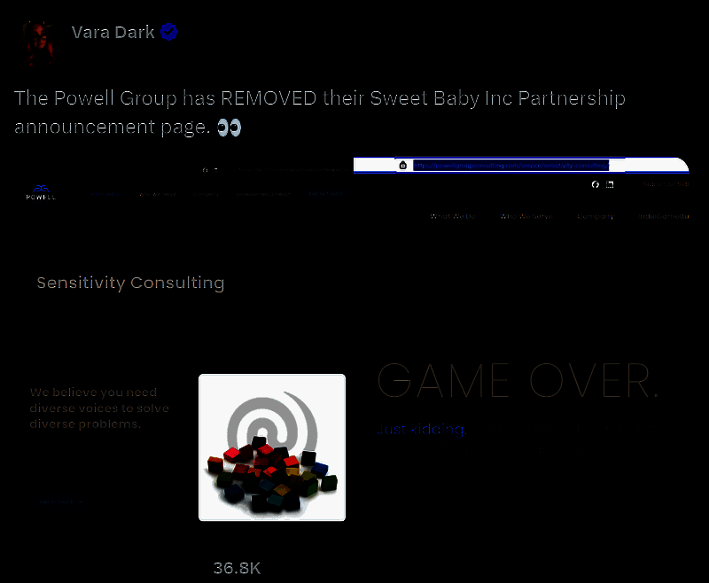 最大游戏咨询公司之一Powell Group最近在其合作伙伴页面上移除了Sweet Baby公司(以下简称SBI)。然而,就在四天前,这家咨询公司宣布和SBI达成合作,帮助达到更广泛的受众。