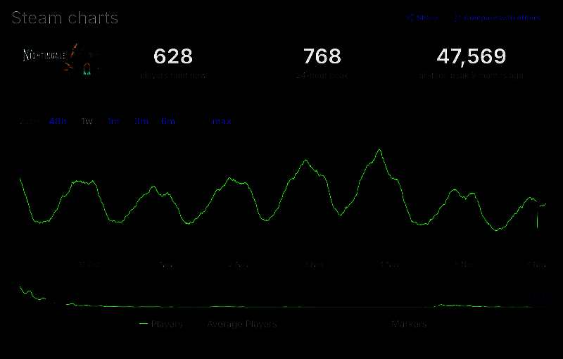 根据 Steam 统计数据显示,《夜莺传说》自发售以来玩家人数峰值仅为4.7 万人,且目前的日活跃峰值仅为768 人。根据统计推测,游戏 Steam 的销量在 29 万至 44 万份,这并不是一个理想的成绩。
