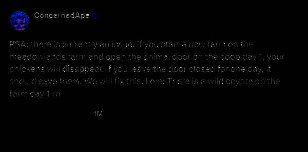 开发者ConcernedApe也很快注意到了这个问题,因此在个人推特上提醒玩家可以通过在第一天关闭鸡舍大门来“拯救”小鸡。不过他也在声明中开玩笑的表示玩家的“小鸡被一只野生郊狼叼走了”。