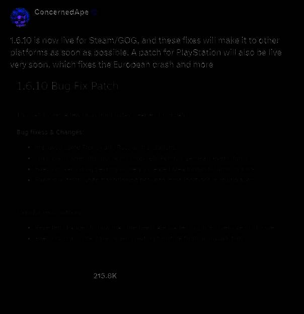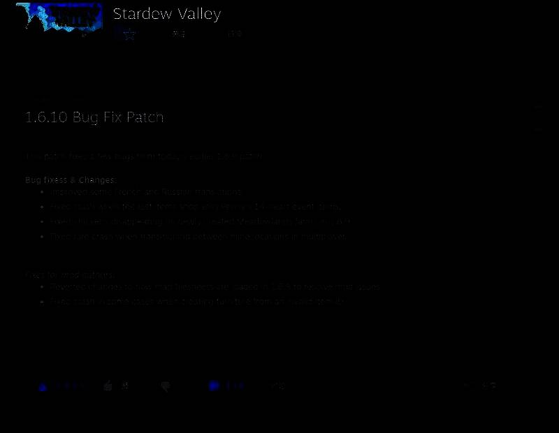 不过ConcernedApe很快为Steam和GOG平台的《星露谷物语》推出了1.6.10版本补丁,并且修复了包含小鸡消失在内的多个问题,而其他平台的对应补丁也将尽快上线。