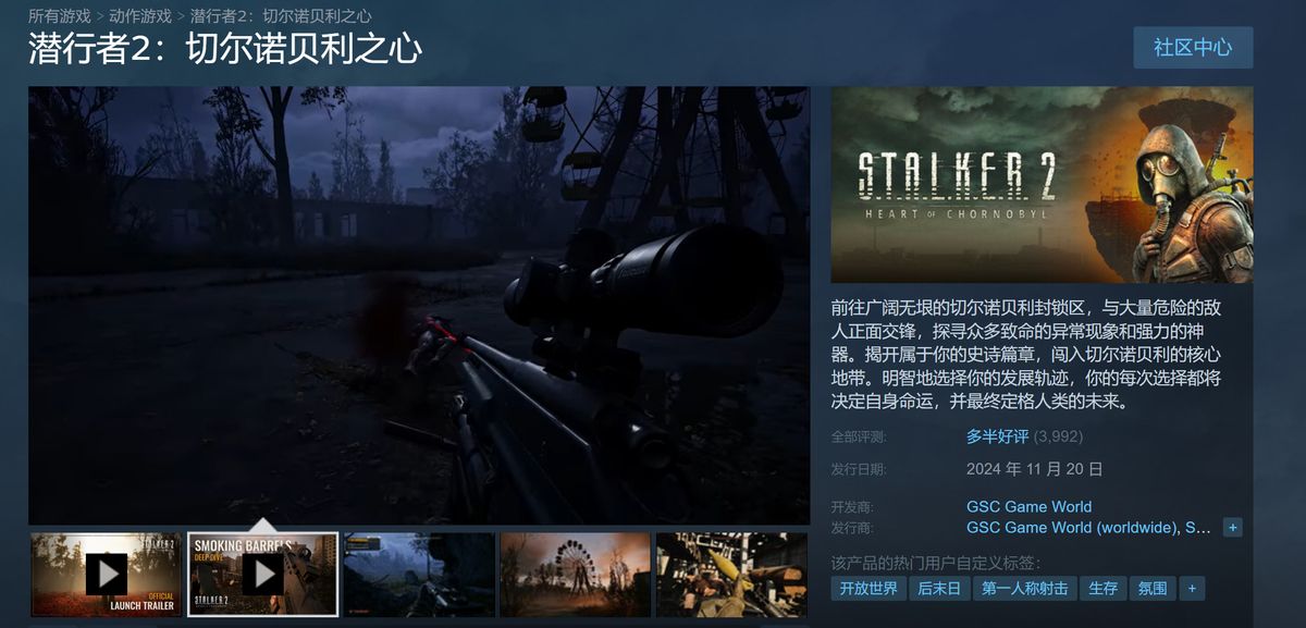 《潜行者2》现已解锁发售,Steam国区标准版268元,自带简体中文,游戏目前“多半好评”,在3992篇评价中好评率为77%。不过在中文区,《潜行者2》的评价更低一点,好评率61%,为“褒贬不一”。