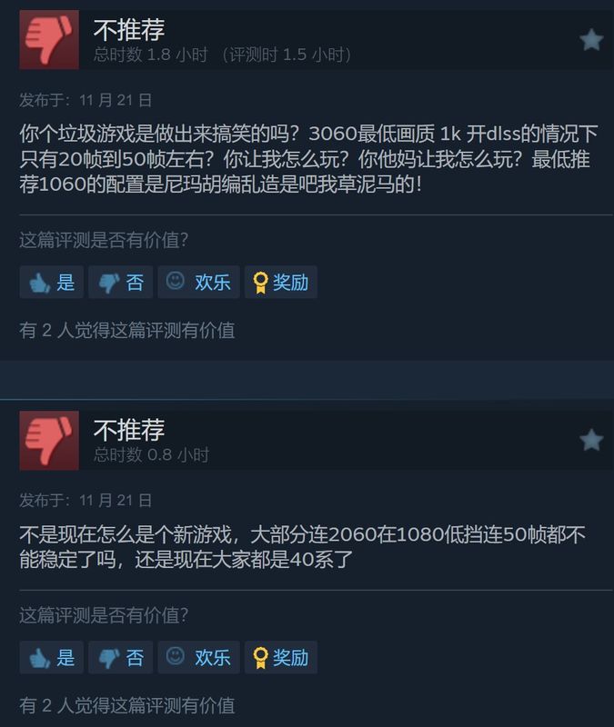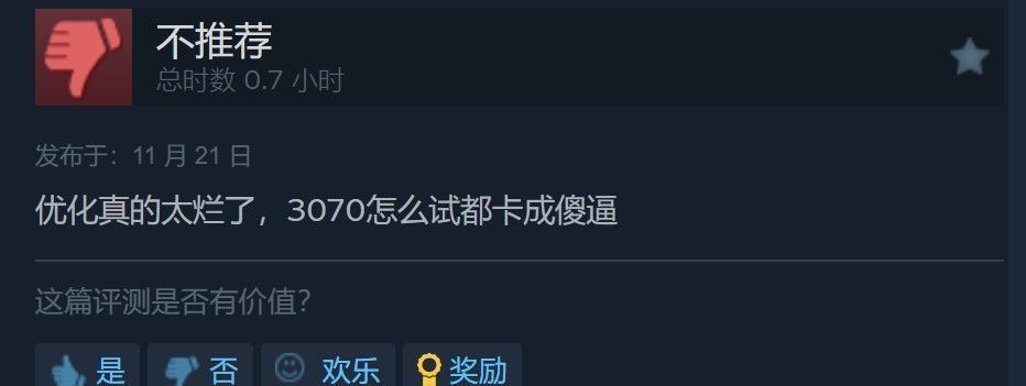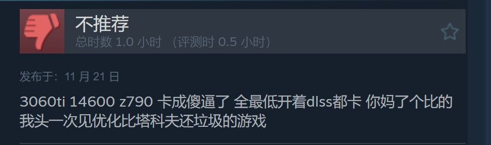 有玩家反应自己的3070显卡直接卡成了幻灯片,官方推荐显卡为RTX 3070Ti和RTX 4070。但即使满足了官方推荐配置也很卡。