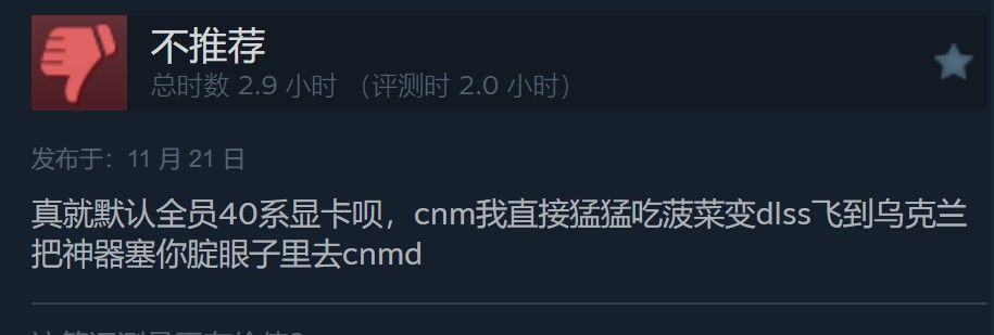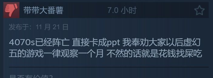 一名用户称自己的显卡是4070Super,但还是卡成了PPT,还“奉劝大家以后虚幻5的游戏一律观察一个月,不然的话就是花钱找S吃”。