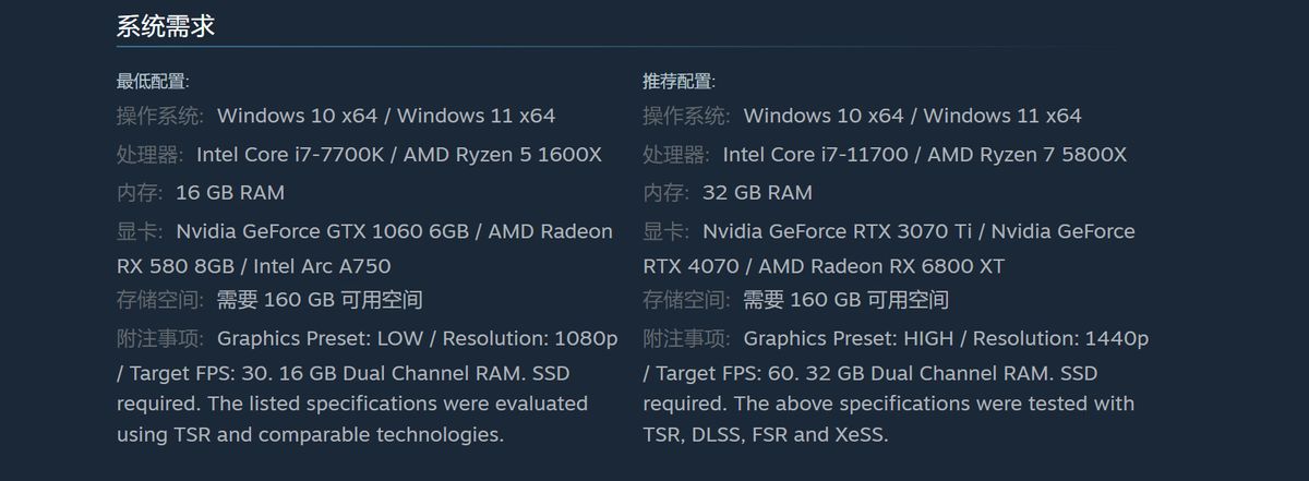 由于该作采用虚幻5引擎开发,对玩家PC的显卡要求很高。官方给出的最低配置(1060,6GB)和推荐配置(RTX 3070Ti)就说明了这一点。