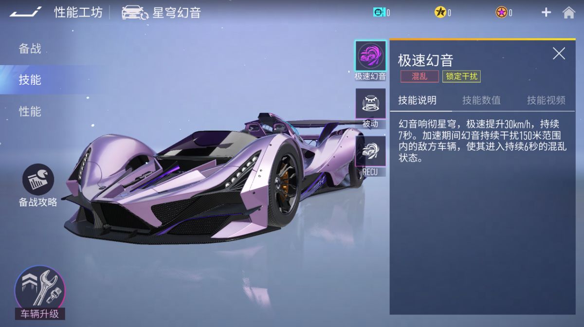 星穹幻音定位为传说级干扰车辆,搭载着全新黑科技-幻音发射器可以向全场播放来自虚拟歌姬未酱的王牌单曲,在洗脑式的旋律中另对手沉迷直至失去对赛车的操控权。大招开启期间不仅自身极速得到大幅度提升,并且发射器释放的幻音,更是能持续影响150米范围内的车辆并陷入混乱状态。自带BGM,飙车更带感!