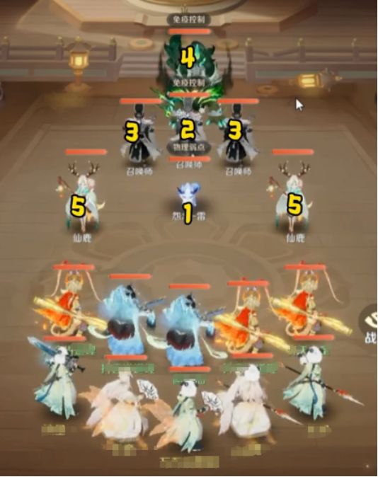 后边的召唤师可以自由控制,封了之后无法召唤,具体的攻击模式以单排或者竖排为主,两个仙鹿以治疗为特色会复活,不过小伙伴们在攻击的过程当中并不用想那么多。首先在开局时优先点击怨雷,清理之后再去控制左右两边的宠物。