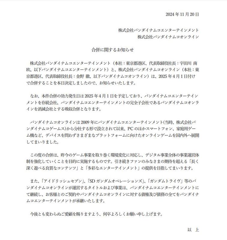 在合并之后,万代南梦宫将接收万代南梦宫在线旗下《蓝色协议》、《SD敢达大作战》、《偶像星愿》等游戏的业务和运营,此前客户与万代南梦宫在线签订的合同以及万代南梦宫在线所欠债务均由万代南梦宫承接。