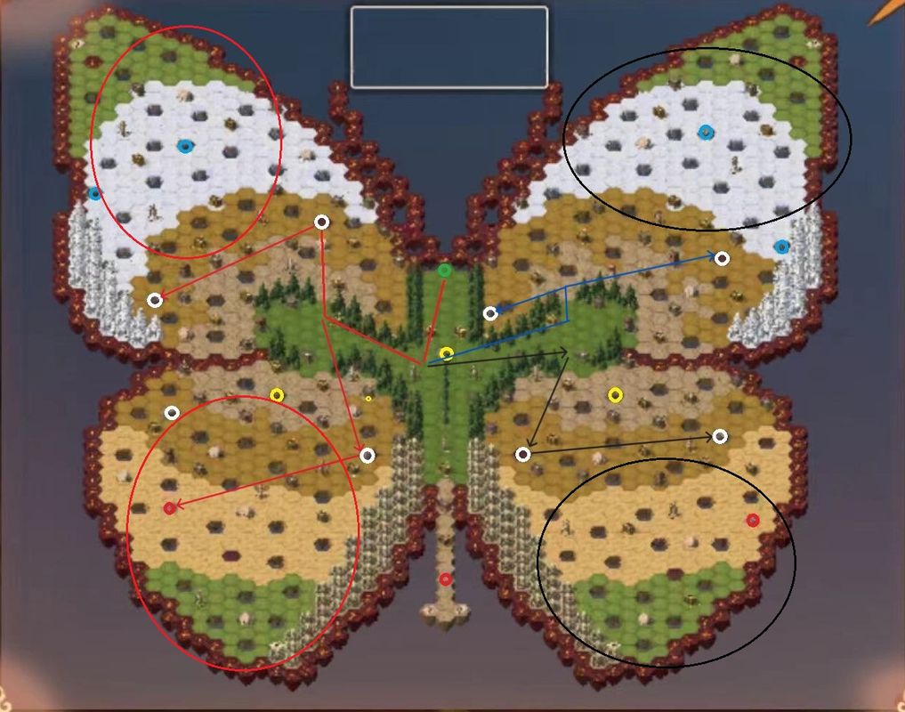 4、争夺排行榜核心思路依靠1队(红色箭头,后续简称1队),2队(蓝色箭头,后续简称2队),3队(黑色箭头,后续简称3队),以最快速度集齐8个“远征”主题徽章(白点);