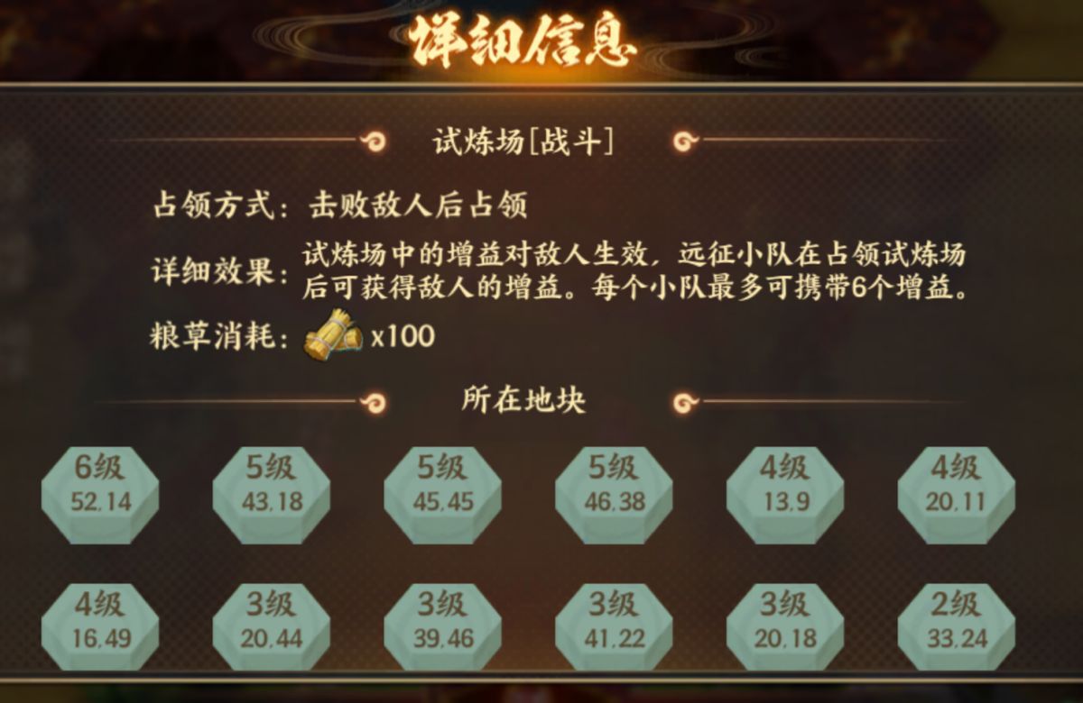 1、在探索的过程中,会出现“试炼场”地块,占领此类地块后,可以获得不同类型的增益,每个小队最多可携带6个增益;