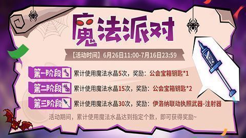 快快邀请你的伙伴来城堡开魔法party~活动期间,累计使用魔法水晶达到指定个数,即可获得公会宝箱钥匙&联动武器【注射器】!