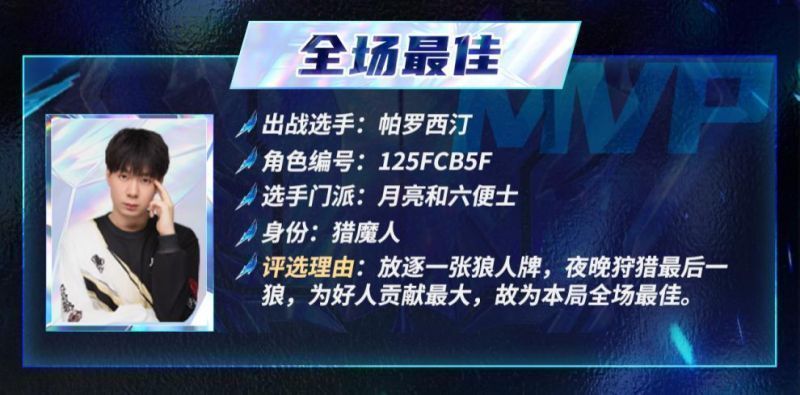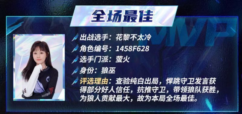 6月21日的对局中,来自萤火门派的选手花黎不太冷,在拿到狼巫身份牌后,不仅成功查验纯白之女出局,同时选择悍跳守卫成功,通过精彩的发言获取了多数好人的信任,带领狼人阵营拿下了游戏胜利,并获得了当局游戏的全场最佳。