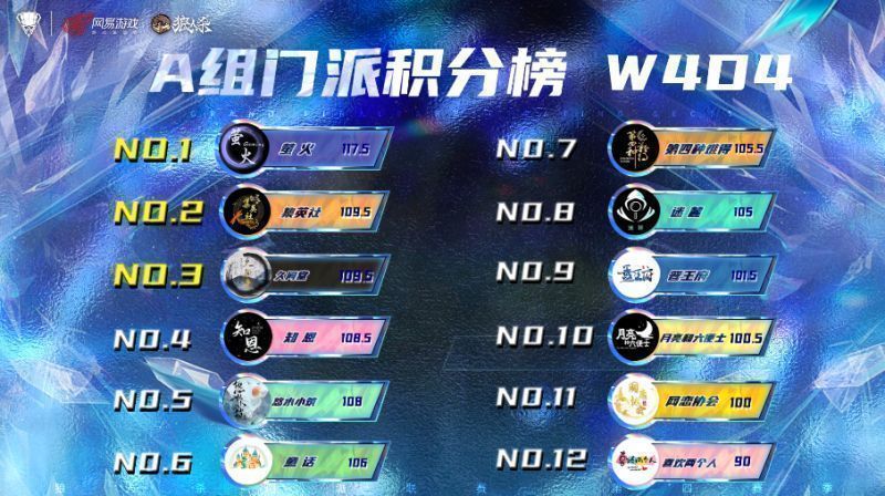 截止目前,A、B两组的积分榜也已经正式发布,A组中萤火门派以117.5分遥遥领先,集英社目前以109.5分排名第二,久间堂排名第三。此前排名第一的悠水小筑本周暂时落后至第五名。