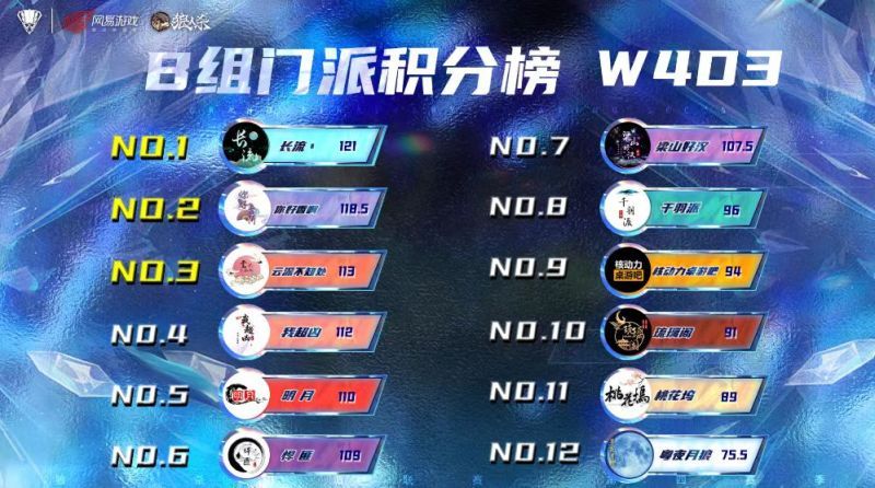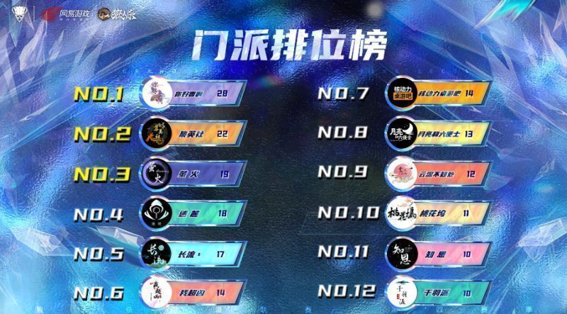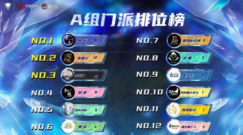 截止目前,第二轮分组的门派排位榜前十二名已经诞生,A组积分排名第一的萤火门派获得19分联赛积分,排至第3位。B组积分排名第一的长流门派获17联赛积分,排至第5位。