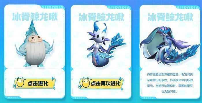 比如冰脊鲸龙啾,二阶段的进化像一只可爱的美人鱼,到了三阶段则像霸气的食人鲨,拥有一股乘风破浪的气势。