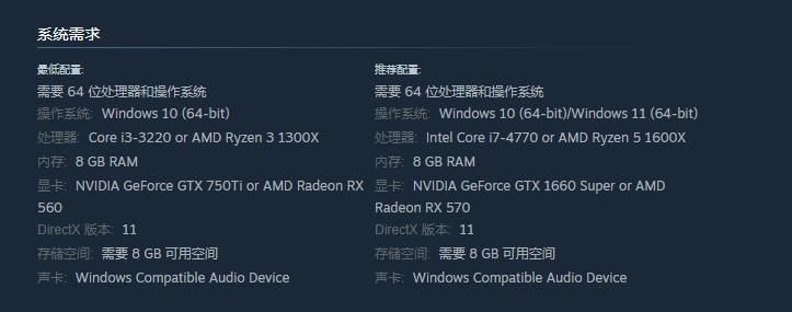 显卡: NVIDIA GeForce GTX 750Ti or AMD Radeon RX 560