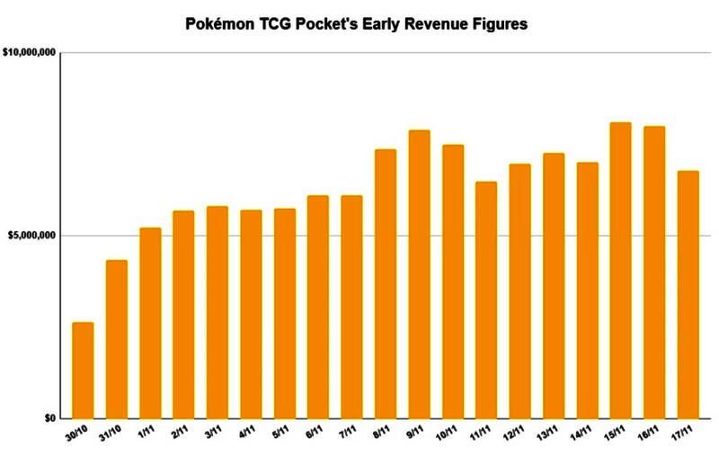 此前就有报道表示《宝可梦集换式卡牌Pocket》在发行后的4天时间就赚了1210万美元,现在有更详细的数据透露《宝可梦集换式卡牌Pocket》首周收入为3580万美元(尚未打破《宝可梦GO》首周5800万美元收入的纪录)。此外《宝可梦集换式卡牌Pocket》第二周的收入为4850万美元,第三周收入则达到3720万美元。