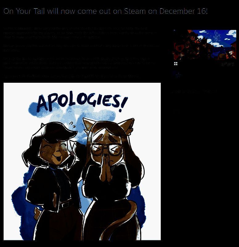 11月20日,叙事冒险游戏《On Your Tail》宣布将Steam版延期至12月16日发售,Switch版延期至2025年2月发售,该作原定于11月21日推出Steam版,官方给出延期理由是为了游戏能带来最佳的体验。